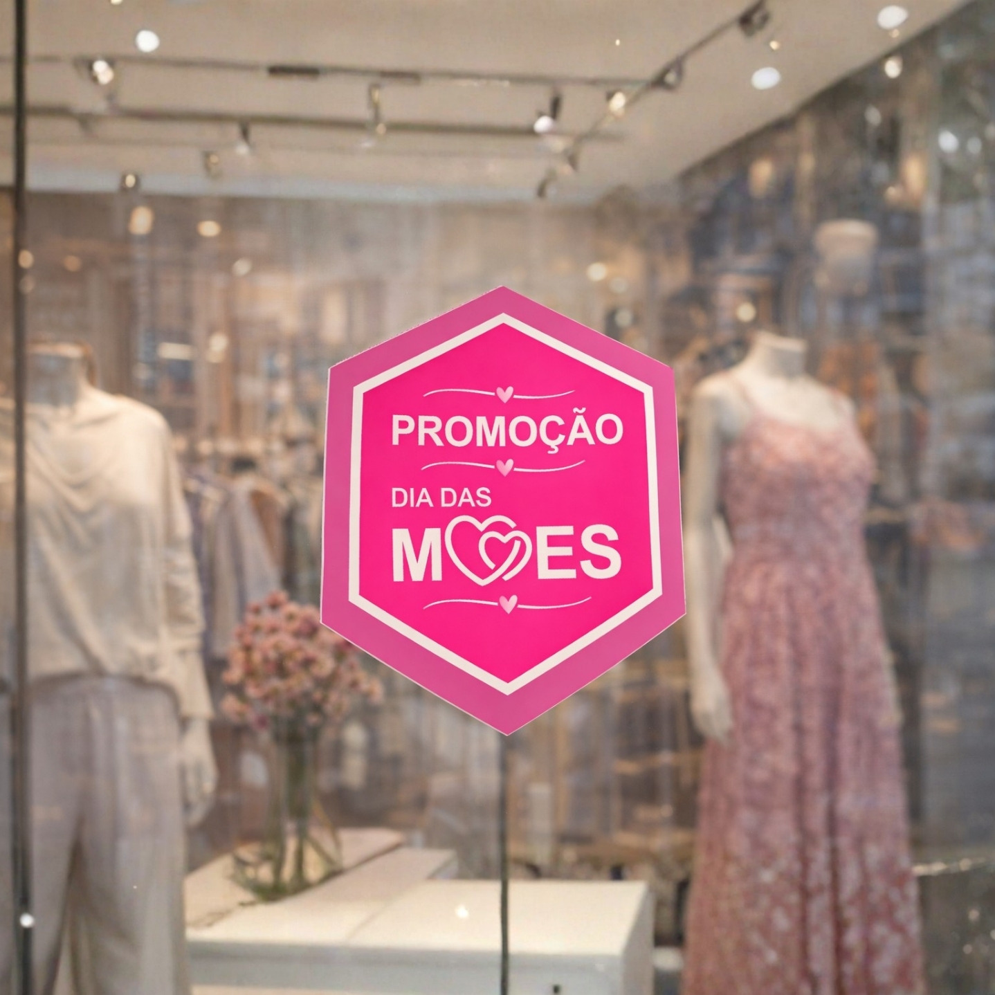 O Adesivo de Vitrine Dia das Mães no formato Hexágono (59×69 cm) é a escolha ideal para destacar campanhas promocionais com um visual moderno, delicado e diferenciado. O formato hexagonal foge do padrão tradicional, criando impacto visual imediato e valorizando a decoração da vitrine.
