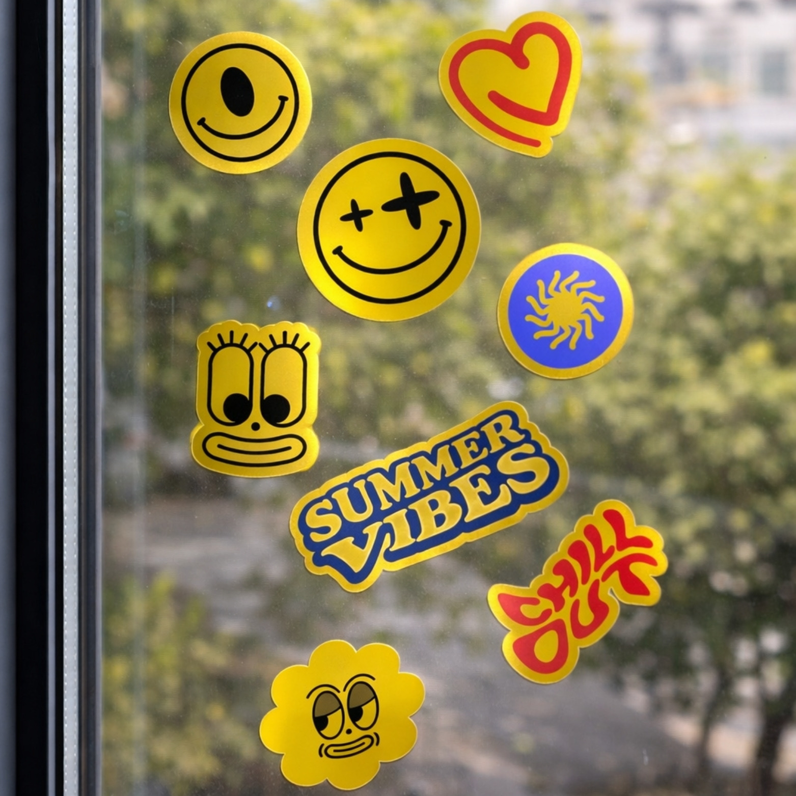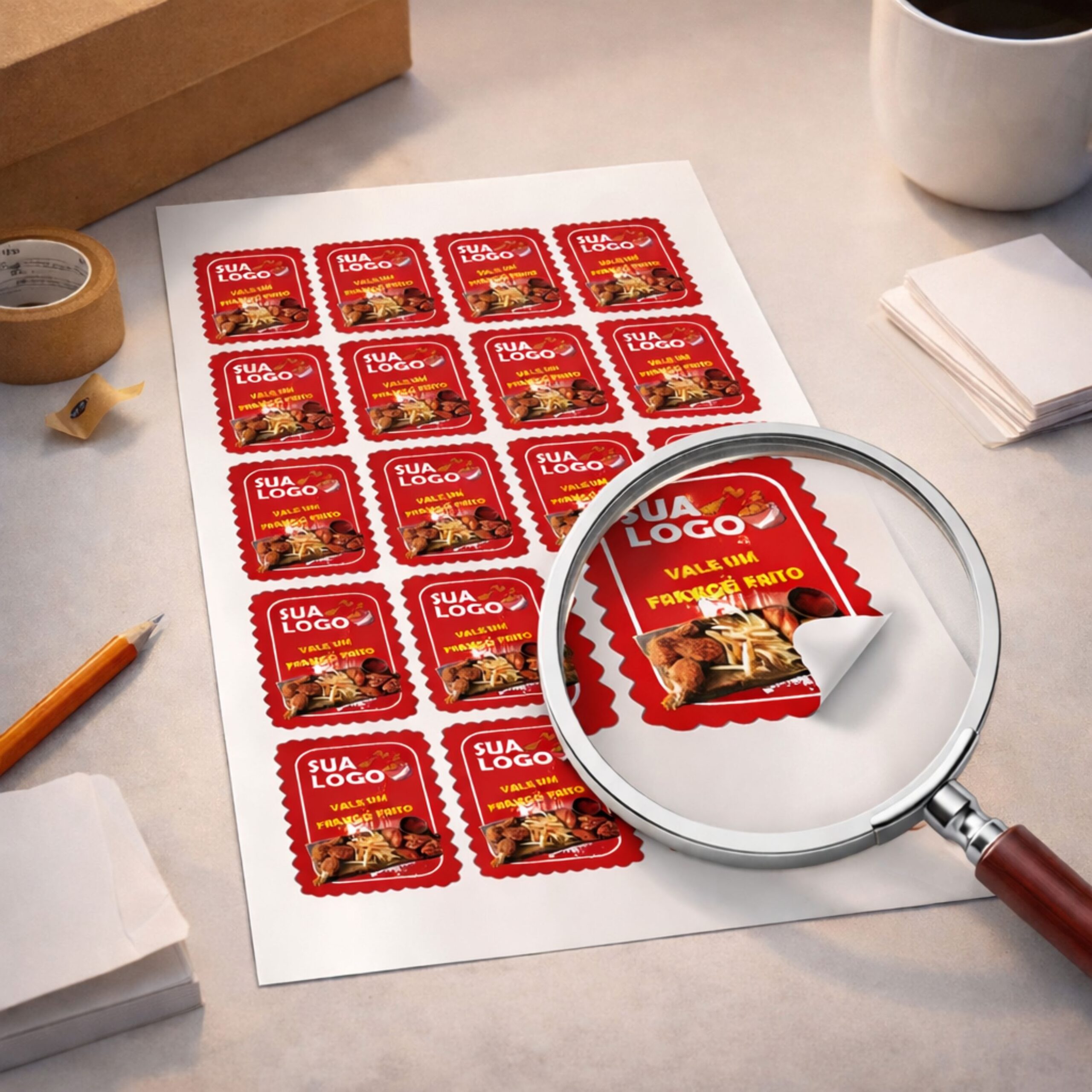 Todos os adesivos são produzidos em folhas A3, o que permite organizar diversos tamanhos e formatos dentro de uma mesma folha, aproveitando melhor o espaço e garantindo maior flexibilidade na produção.
