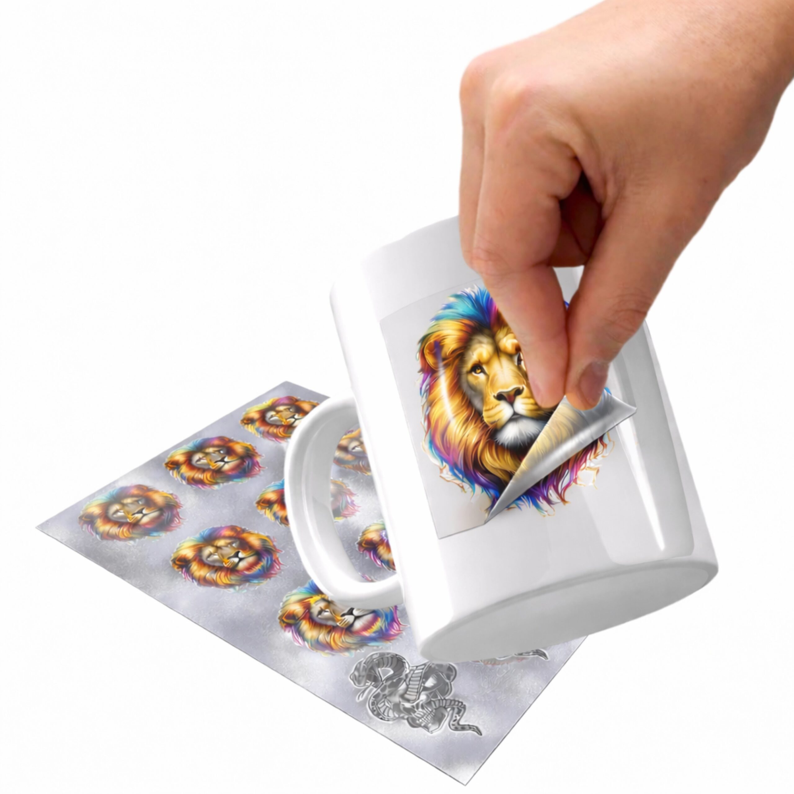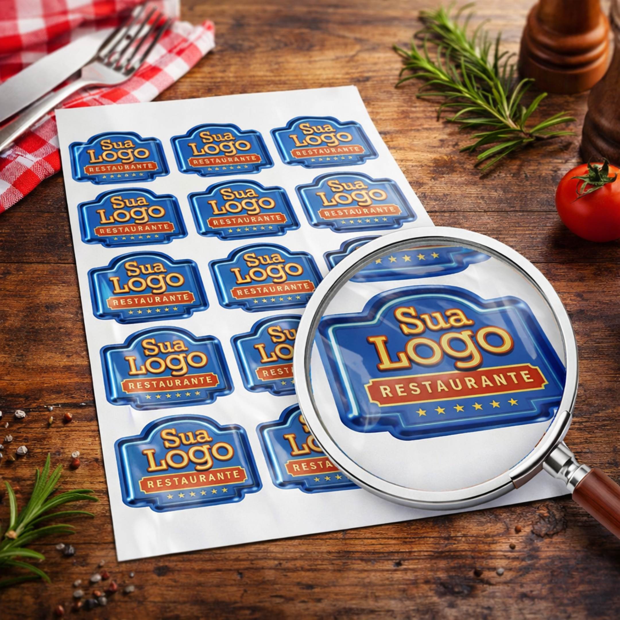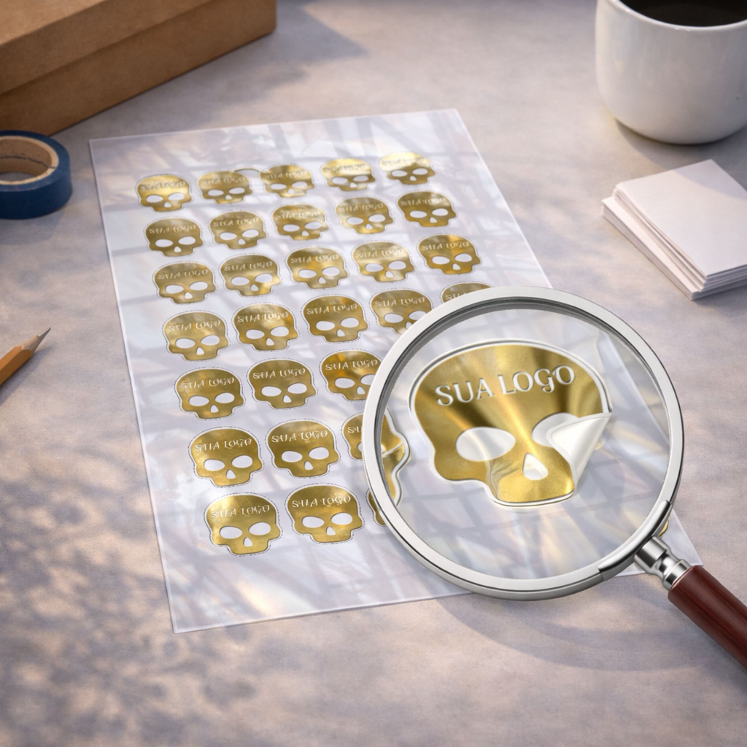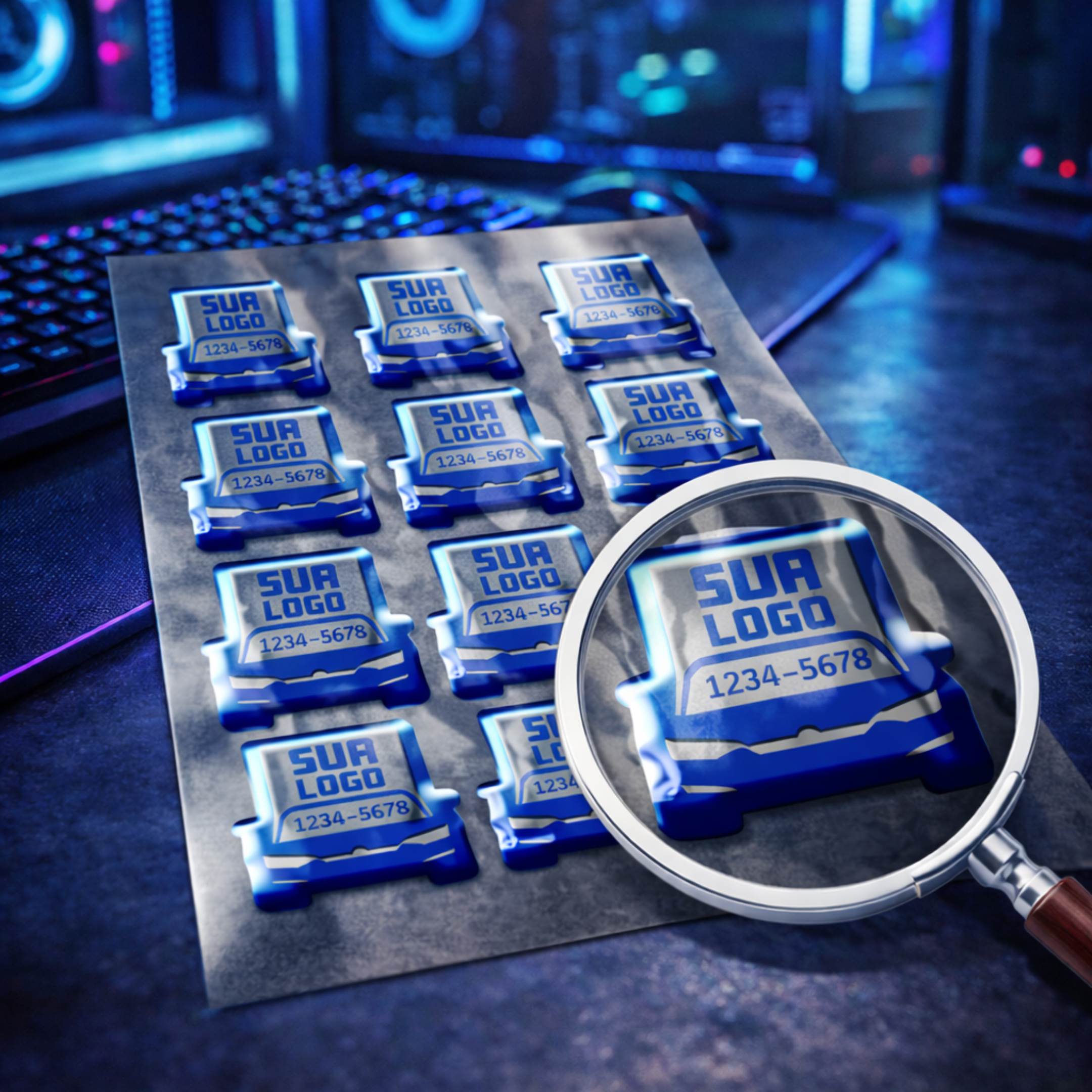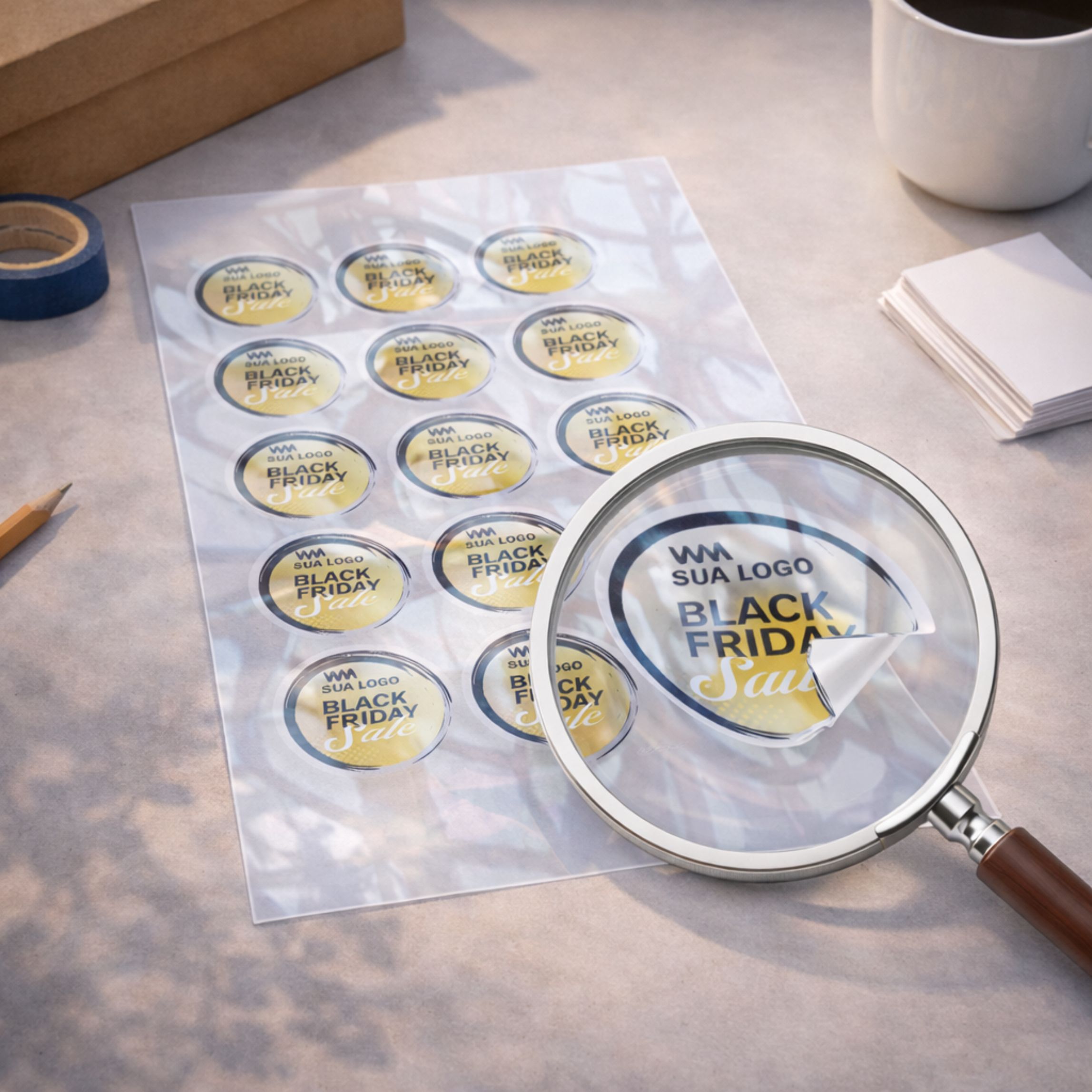 • Adesivo em Folha A3 Resinada – adesivos impressos em folha A3 com aplicação de resina transparente sobre a arte, criando um efeito alto-relevo com brilho intenso. Ideal para etiquetas premium, logomarcas, brindes e aplicações que exigem um acabamento mais sofisticado e durável.