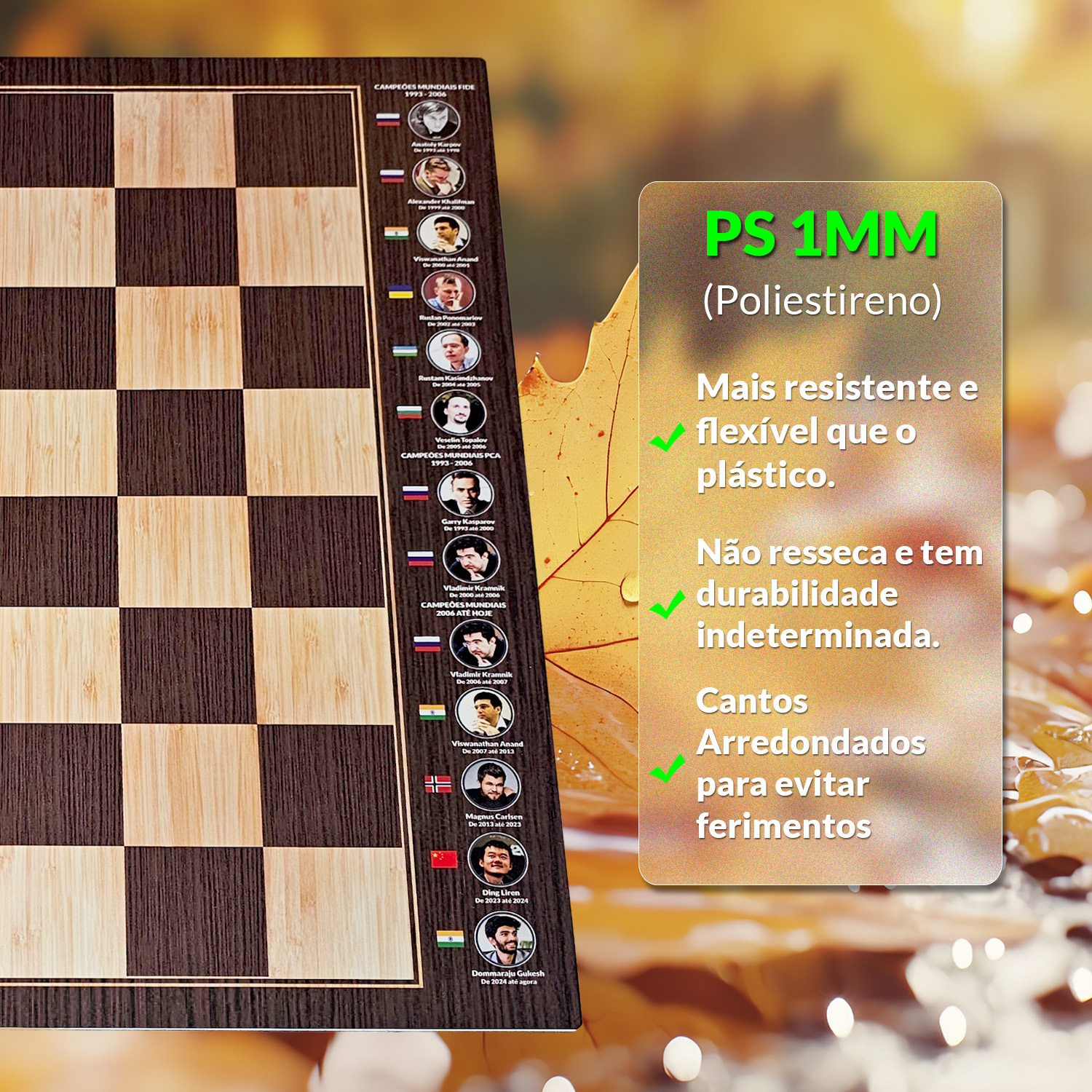 Nossos tabuleiros em PS 1mm são produzidos com o objetivo de tornar seu deslocamento mais prático (especial para estudos, clubes, associação e federações, que precisam transportar grande quantidade ou até mesmo uma única unidade, sem muito peso), leve e rápido, porém, sem perder sua beleza e qualidade. São produzimos com adesivo em alta resolução e laminação fosca de alta resistência por cima, tornando assim, sua durabilidade indeterminada.