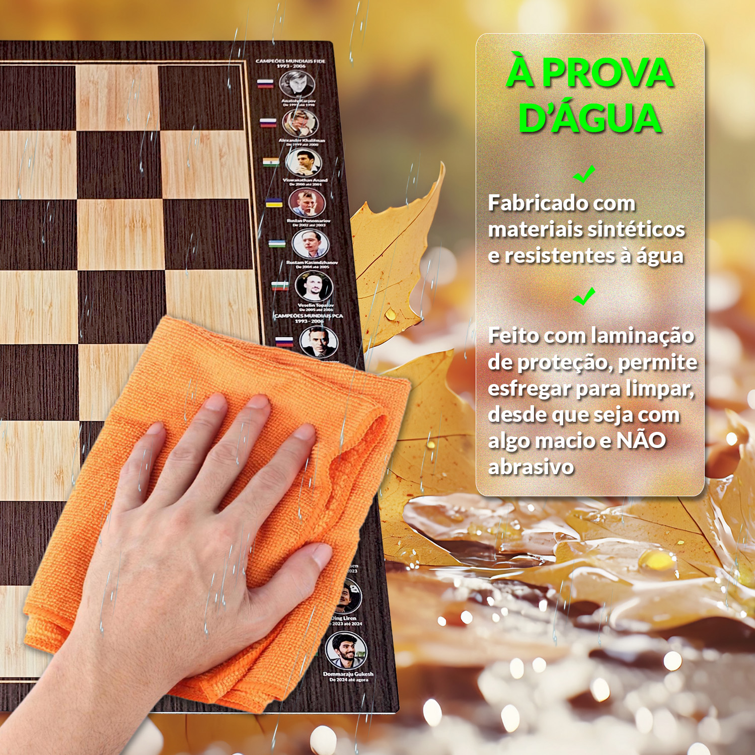 Nas bordas, as imagens dos maiores Campeões Mundiais do xadrez eternizam partidas históricas e inspiram novos lances a cada jogo.