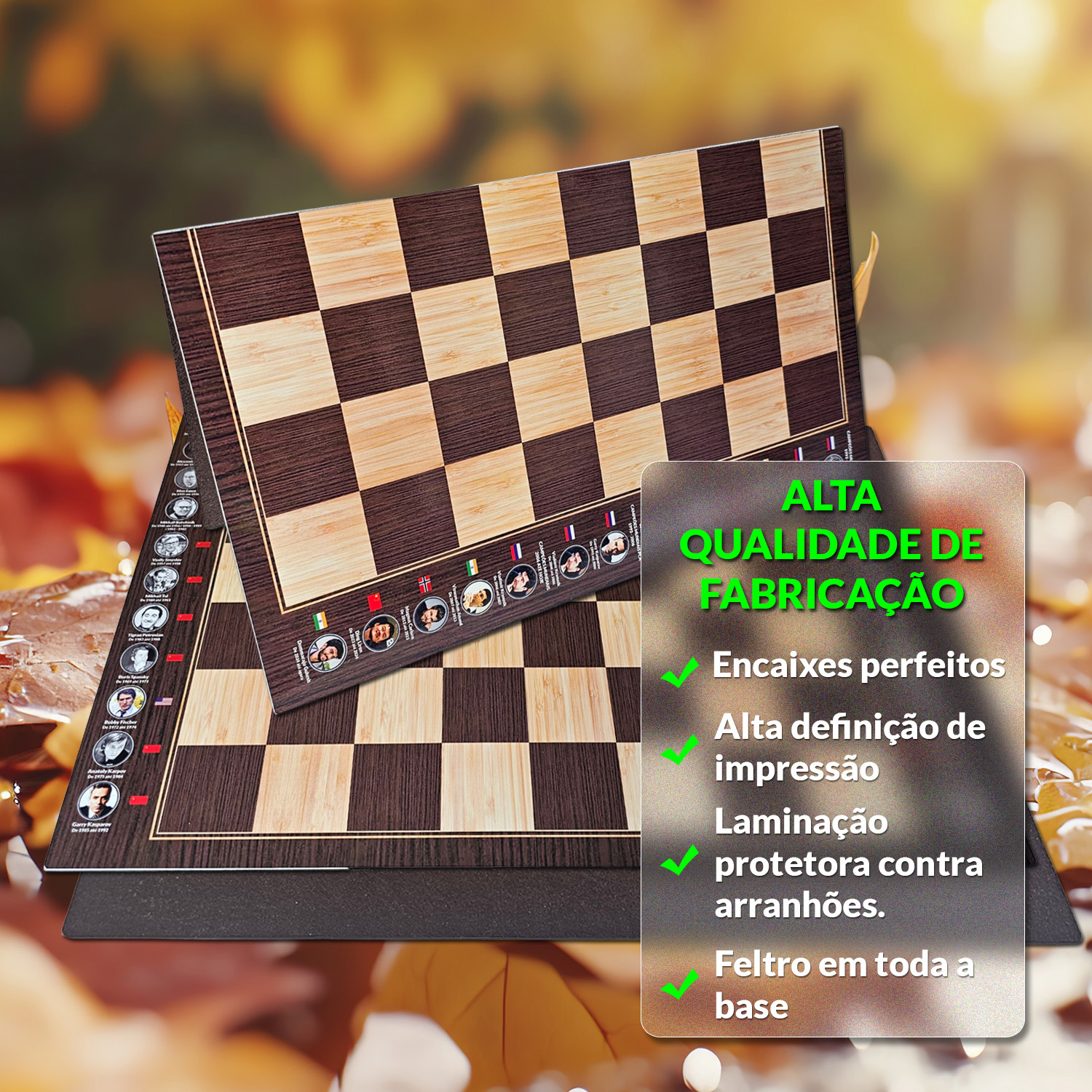 Nossos tabuleiros de xadrez são confeccionados nos mais altos padrões do mercado.