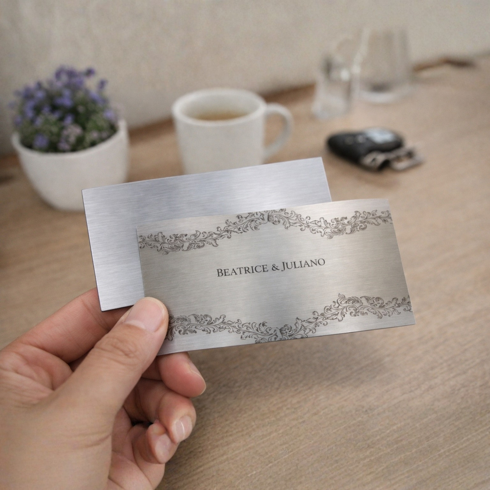 No tamanho padrão 9 × 5 cm, mantém o formato tradicional, mas com um nível de acabamento muito superior ao papel convencional. O resultado é um cartão que não apenas informa, mas impressiona.