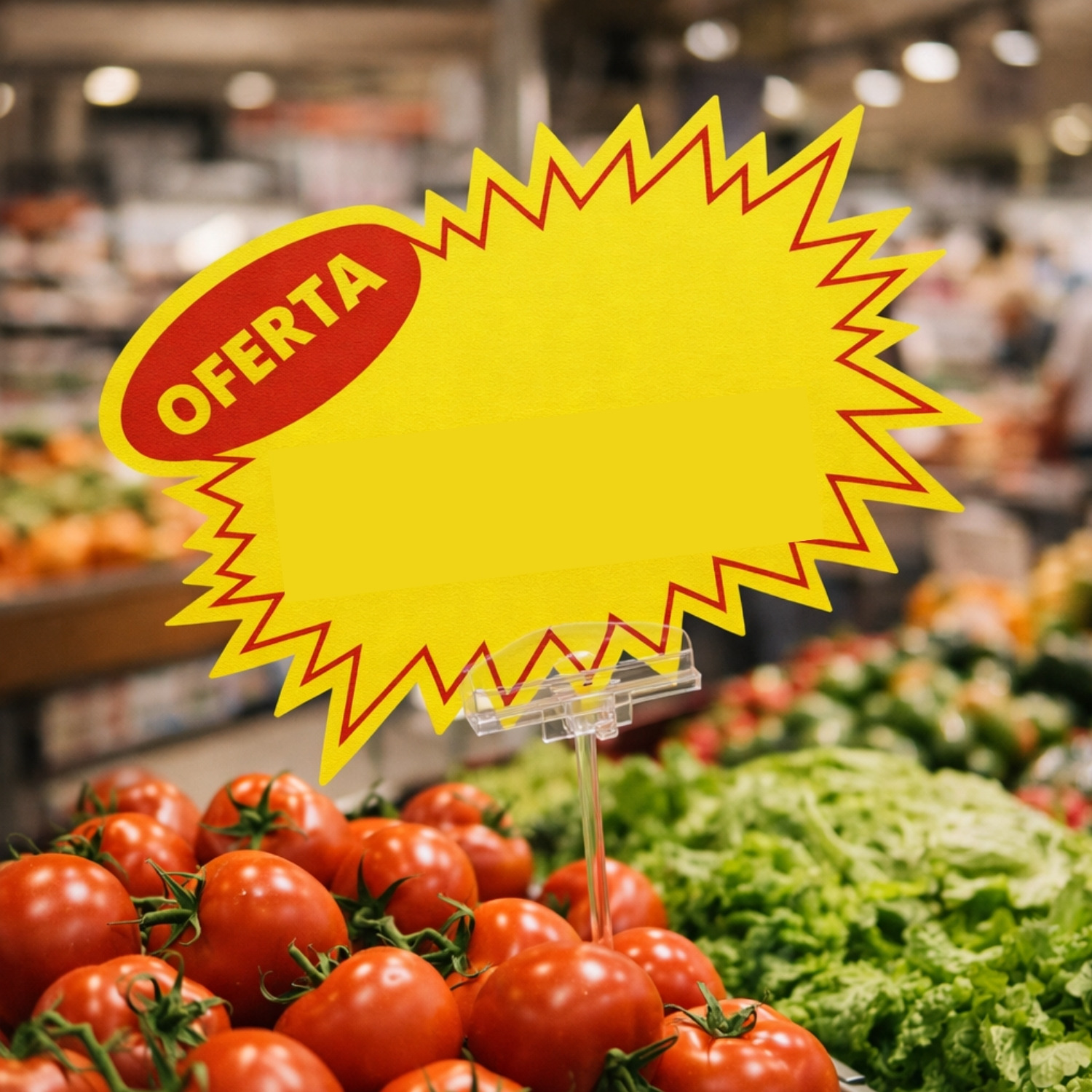 Seu formato especial Splash possui recorte irregular e dinâmico, criando um visual chamativo e moderno que atrai o olhar do cliente imediatamente. Esse formato é amplamente utilizado em vitrines, prateleiras e áreas promocionais de lojas, justamente por transmitir sensação de urgência e destaque.