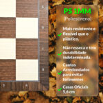 Nossos tabuleiros em PS 1mm são produzidos com o objetivo de tornar seu deslocamento mais prático (especial para estudos, clubes, associação e federações, que precisam transportar grande quantidade ou até mesmo uma única unidade, sem muito peso), leve e rápido, porém, sem perder sua beleza e qualidade. São produzimos com adesivo em alta resolução e laminação fosca de alta resistência por cima, tornando assim, sua durabilidade indeterminada.