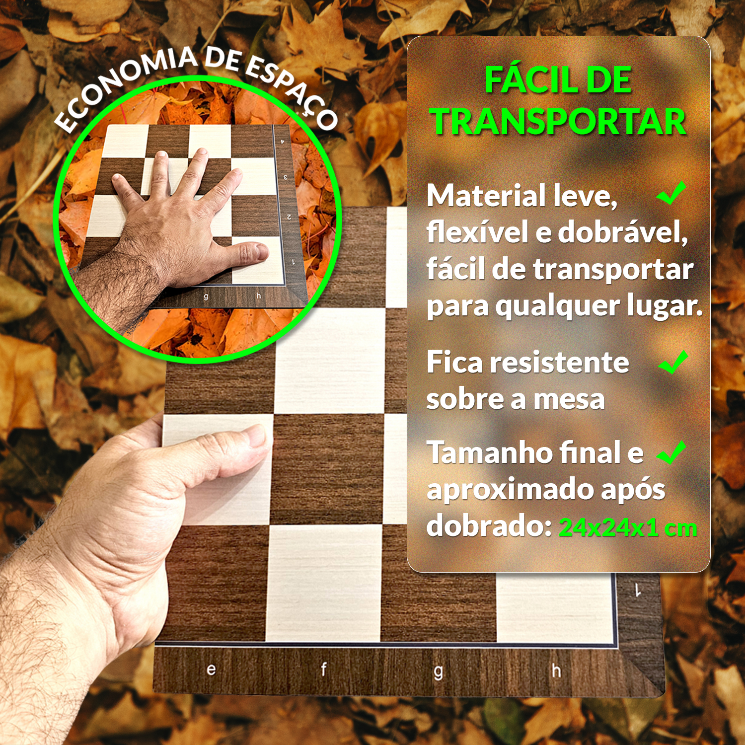 Fabricado em PS 1mm com laminação protetora, o tabuleiro é à prova d’água, resistente a arranhões e extremamente durável, ideal para o uso diário, ambientes externos ou transporte constante. Seus cantos arredondados garantem segurança no manuseio, evitando acidentes, enquanto o encaixe perfeito na dobra mantém a superfície estável e perfeitamente plana durante o jogo. A impressão de alta definição e o acabamento refinado refletem o padrão de qualidade da Gráfica Arejano, oferecendo um produto que une funcionalidade, resistência e beleza em cada detalhe.
