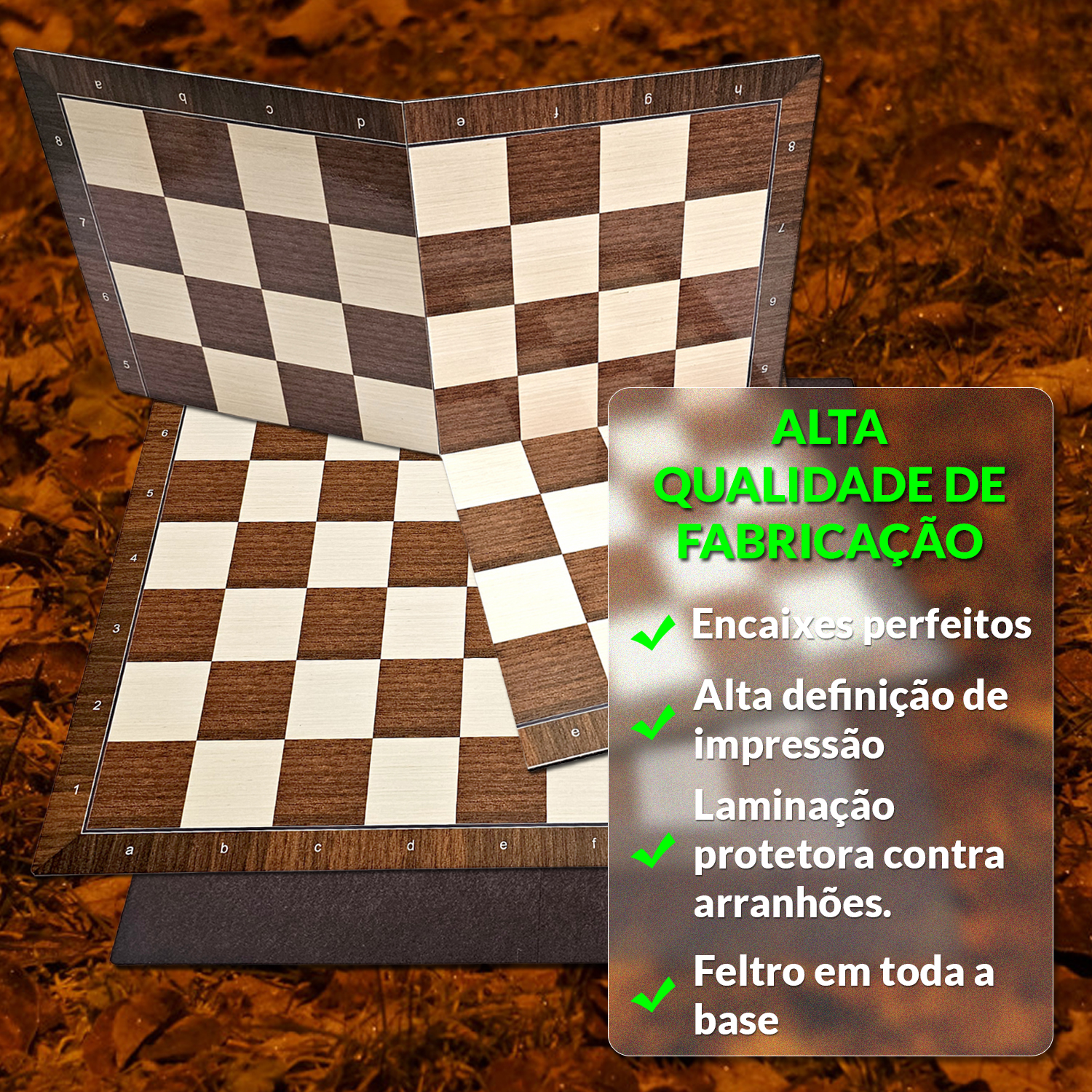 Nossos tabuleiros de xadrez são confeccionados nos mais altos padrões do mercado.