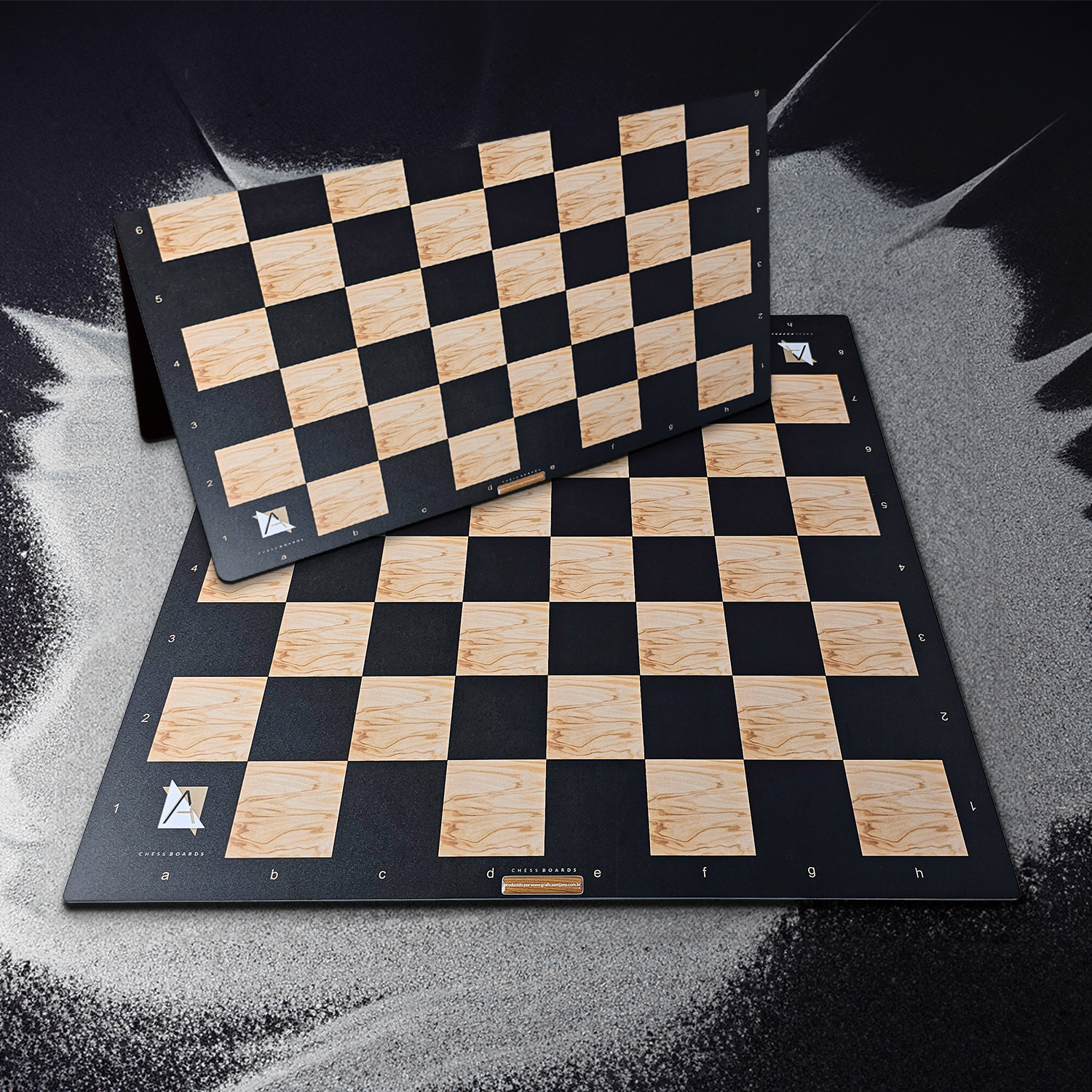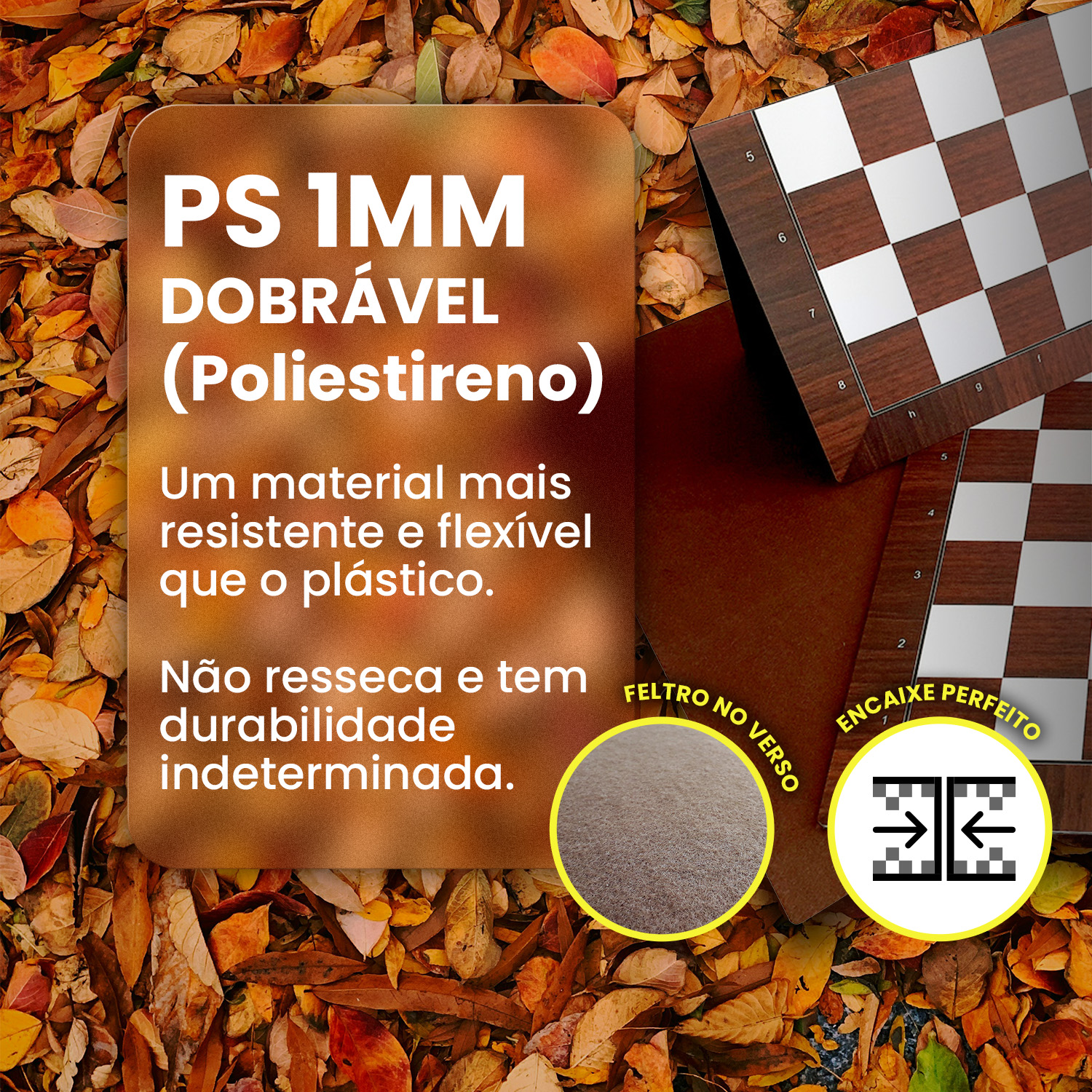 Nossos tabuleiros em PS 1mm são produzidos com o objetivo de tornar seu deslocamento mais prático (especial para estudos, clubes, associação e federações, que precisam transportar grande quantidade ou até mesmo uma única unidade, sem muito peso), leve e rápido, porém, sem perder sua beleza e qualidade. São produzimos com adesivo em alta resolução e laminação fosca de alta resistência por cima, tornando assim, sua durabilidade indeterminada.